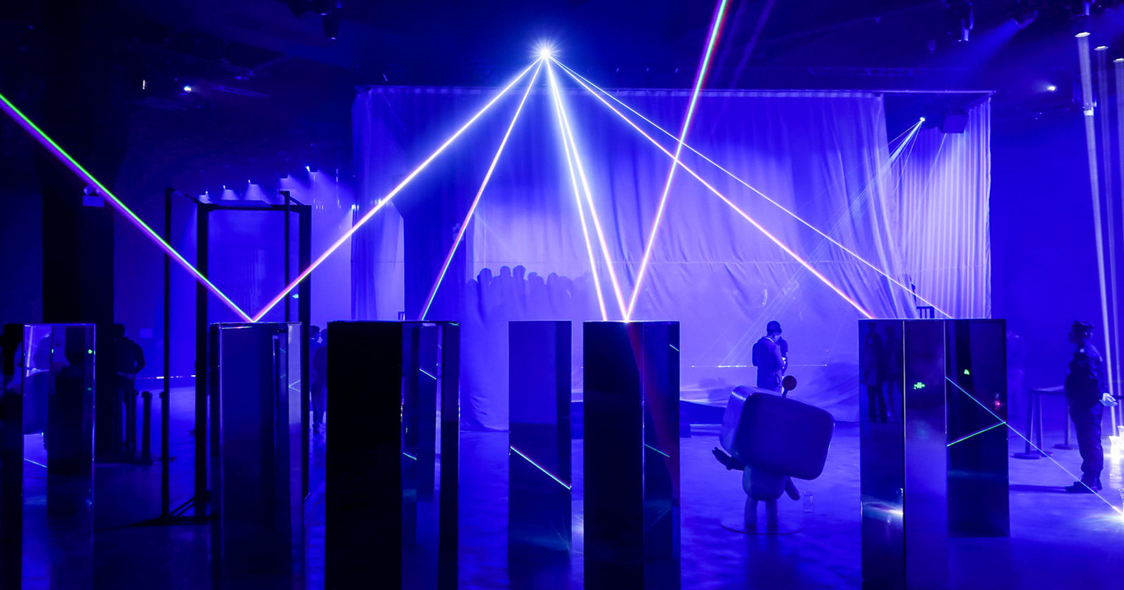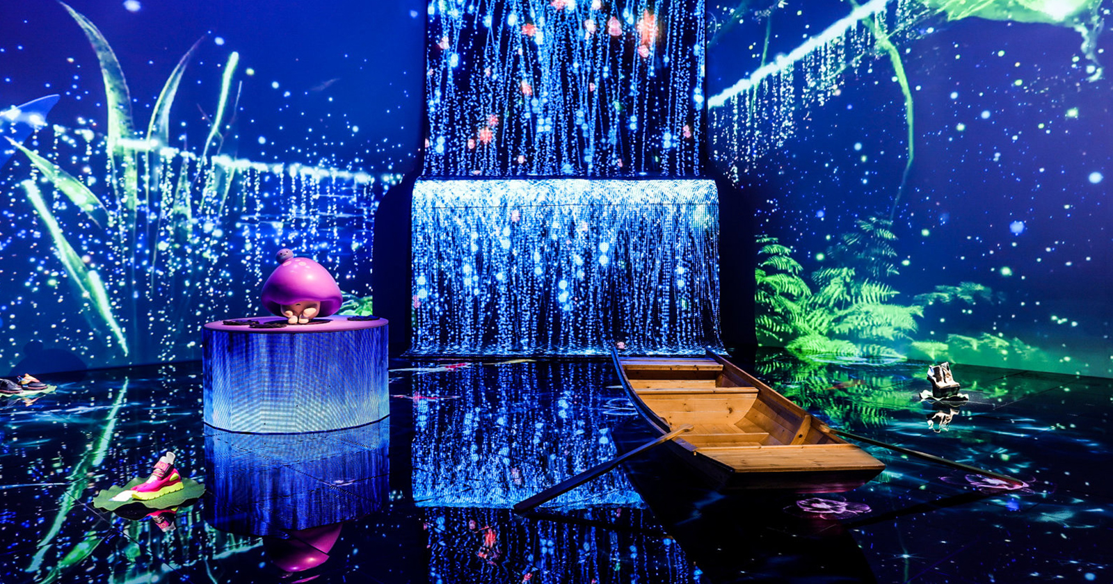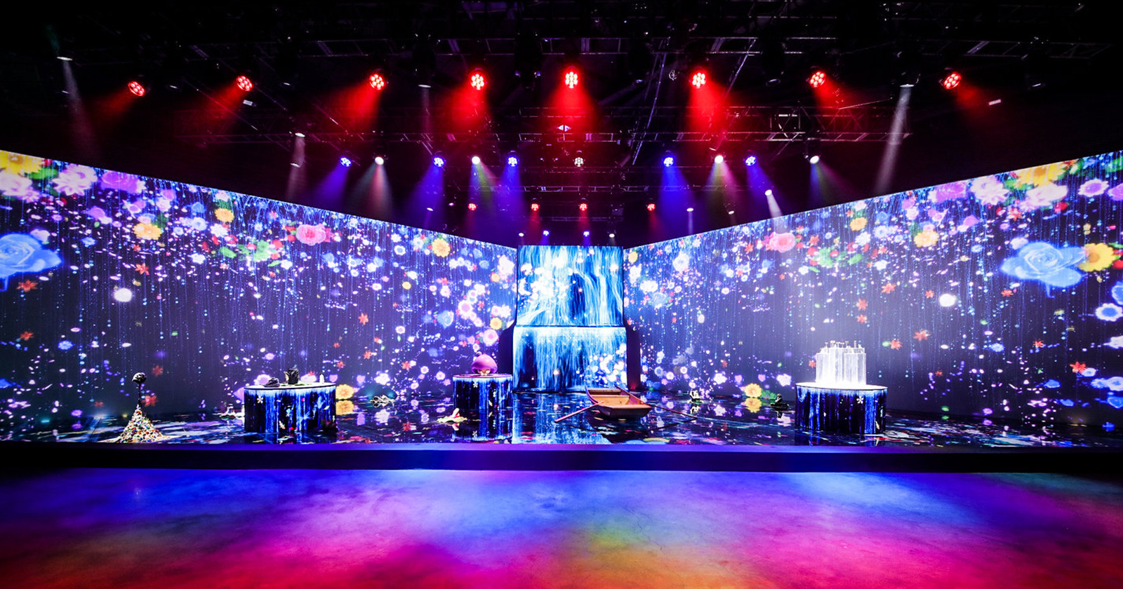 Eidetic took on this monumental mission of taking the event where every year the objective of the event is to show newly launched technology to target audiences effectively, and then combine that style of demonstration with an art exhibition successfully. We added the artistic atmosphere by separating the space into 4 seasons, with a day and night cycle. In the spring zone, the bamboo forest represented growth, lotus leaves floating on an LED screen pond and an LED waterfall with boats installed represented summer; in autumn, there was a yellow tent, parted open to reveal projections of poetic phrases; and the winter displayed vivid images of ice, snow, blizzards and icicles, with moving LED strips and laser emphasis.
